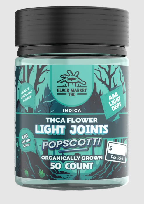 POPSCOTTI (Indica) / Black Market THC – THCA LIGHT JOINTS- Organically Grown Flower Joints (AAA LIGHT DEPS)