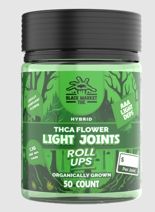 Roll Ups (Hybrid) / Black Market THC – THCA LIGHT JOINTS- Organically Grown Flower Joints (AAA LIGHT DEPS)